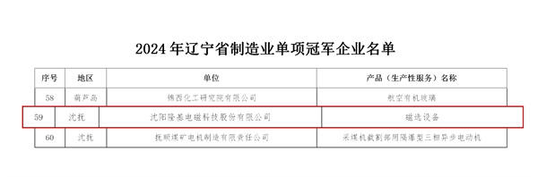 沈陽(yáng)隆基磁選設(shè)備入選《2024年遼寧省制造業(yè)單項(xiàng)冠軍》