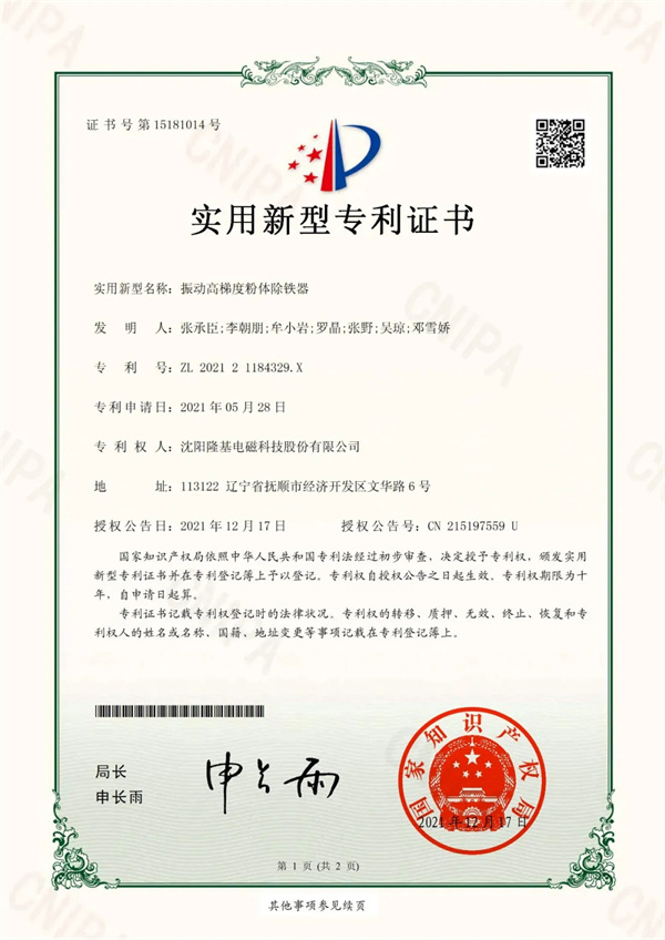 新年伊始,捷報頻傳 ,隆基振動高梯度粉體除鐵器,再獲專利授權 2022-01-17