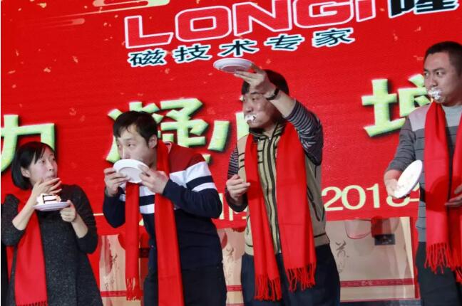 公司貼心的為本命年的60位員工送上紅圍巾,祝福他們在狗年順順利利,紅紅火火。而后別開生面的吃蛋糕比賽,讓會場里笑聲連連。