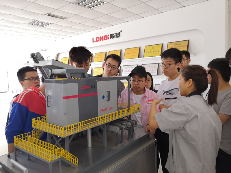 在工作人員的帶領下,師生們首先參觀了公司展廳,在反映隆基發展歷程的展板前,東大的師生們了解了公司的經營規模、發展歷程、企業文化及獲得榮譽。隨后,師生們前往公司研發中心及生產車間,對公司的研發實驗能力及生產制造實力進行了了解。參觀過程中,工作人員向同學介紹了除鐵器、LPPC分選機、渦流分選機等產品的生產工藝、工作原理及產品性能等,并熱情地解答了同學們在參觀過程中提出的技術問題。