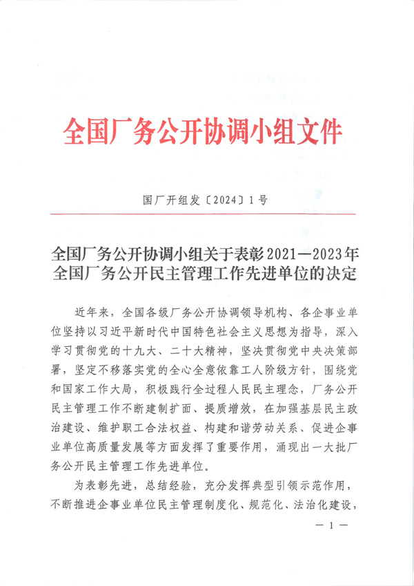 近日,全國廠務公開協調小組下發《關于表彰2021—2023年全國廠務公開民主管理工作先進單位的決定》。沈陽隆基電磁科技股份有限公司榮獲2021—2023年全國廠務公開民主管理先進單位。