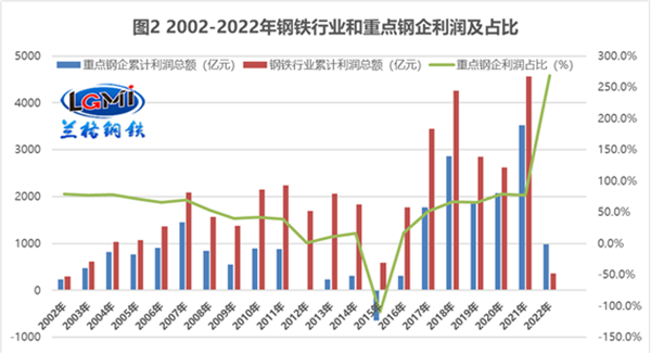 其一,從粗鋼產(chǎn)量數(shù)據(jù)來看,2022年全國粗鋼產(chǎn)量10.13億噸,其中重點鋼企粗鋼產(chǎn)量8.15億噸,占總產(chǎn)量的80.5%(詳見圖1)。從營收數(shù)據(jù)來看,2022年鋼鐵行業(yè)實現(xiàn)營業(yè)收入87147億元,其中重點鋼企實現(xiàn)營業(yè)收入65875億元,占總營收的75.6%。從銷售利潤率數(shù)據(jù)來看,2022年鋼鐵行業(yè)全年的銷售利潤率僅僅為0.4%,而重點鋼企的銷售利潤率為1.5%,高出整體行業(yè)1.1個百分點。從利潤數(shù)據(jù)來看,2022年鋼鐵行業(yè)實現(xiàn)利潤總額365.5億元,其中重點鋼企實現(xiàn)利潤總額982億元,重點鋼企的利潤總額竟然高出整體行業(yè)如此之多(詳見圖2),而作為鋼企龍頭的中國寶武去年實現(xiàn)利潤總額312.8億元,占重點鋼企利潤的31.8%;而暫居鋼鐵行業(yè)利潤榜第二位的湖南鋼鐵集團實現(xiàn)利潤總額150.3億元,占重點鋼企利潤的15.3%;中國寶武和湖南鋼鐵集團總計的利潤占比達(dá)到了47.1%,近半壁江山,這表明國內(nèi)鋼鐵行業(yè)兼并重組的效應(yīng)正在深度發(fā)酵著,八成的產(chǎn)量實現(xiàn)了七成的營收更實現(xiàn)了鋼企利潤的明顯提升。