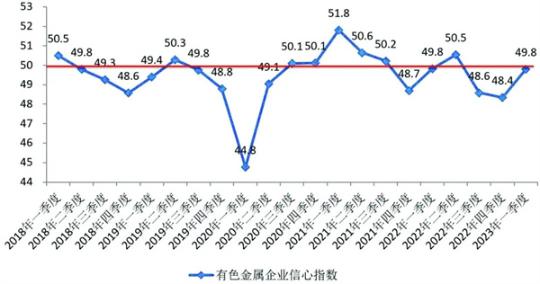 2023年一季度有色金屬企業(yè)信心指數(shù)為49.8,比上季度上升1.4個(gè)點(diǎn)。信心指數(shù)在連續(xù)回落兩個(gè)季度后再次出現(xiàn)回升,接近臨界點(diǎn)50。另外,本期即期指數(shù)為48.6,較上期上升0.1個(gè)點(diǎn);預(yù)期指數(shù)為50.6,較上期上升2.4個(gè)點(diǎn),具體情況詳見圖1和圖2。