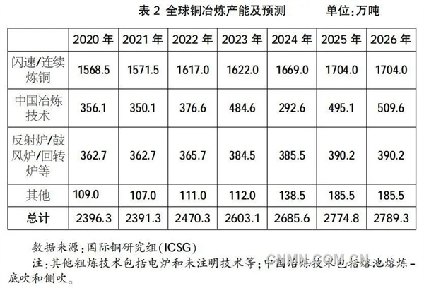 截至2022年底,全球銅冶煉產(chǎn)能2470.3萬噸。其中,使用閃速/連續(xù)煉銅技術(shù)的產(chǎn)能1617.0萬噸,占比為65.5%(見表2)。